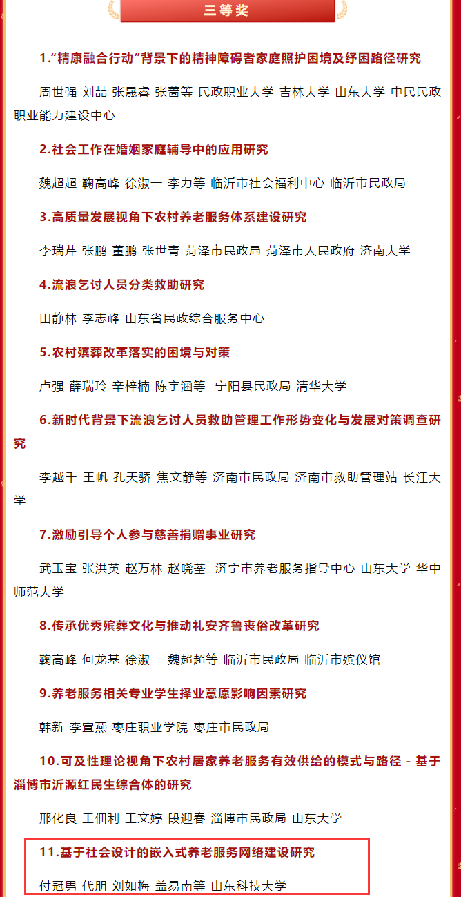 “全国民政政策理论研究奖”是国内民政理论研究领域的最高奖,是由民政部评选并通报决定的部级奖项。今后学院将加强与各级民政部门的交流合作,继续支持科研团队追踪民政热点、难点问题,持续推进民政理论研究与实践工作的高质量发展。