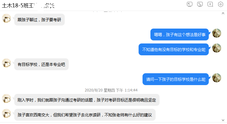 8月份,伟德bevictor中文版学生工作办公室各辅导员通过线上家长会、家长群、电话家访、微信一对一沟通等方式,根据学生具体情况和所处年级和时期,沟通了解学生在家期间的学习生活情况和生活动态,反馈学生在校期间表现,询问家长对学生的培养理念和期望,并给予建议。辅导员鲍娜娜在城乡规划和建筑学专业线上家长会上,向家长们介绍了2015级毕业班的就业与考研情况,并针对考研录取率背后折射出的原因和问题提醒家长们要根据学生实际学习状况规划合理目标、做出最佳选择。
