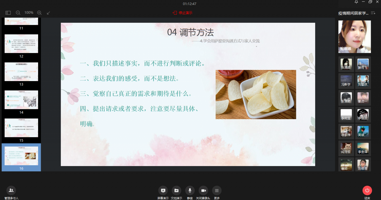 鲍娜娜结合国家疫防控形势,针对停课不停学、居家学习的实际,通过对学生目前居家学习状态及相关心理成因进行系统分析,从学习态度改变、学习动机激发、行为塑造等方面,就居家学习情绪调节、学习计划制定、学习时间安排、学习效率提高以及与家人的沟通等问题,和同学们进行了深入的在线交流、互动和解答,帮助学生调整心态,注重习惯养成,掌握沟通方式,合理规划居家居家时光,充实快乐地度过居家学习生活。