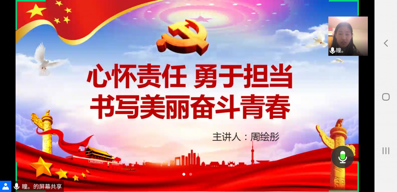 周绘彤依次从党员的先锋模范作用、心怀责任勇于担当、如何做勇于担当的新时代青年、奋斗的青春最美丽四个方面进行宣讲。大事难事看担当,危难时刻显本色。一批批优秀共产党员在与新冠疫情的战役中充分发挥了先锋模范作用,他们用行动彰显责任和担当、书写初心和使命。周绘彤以习近平总书记的话为切入点,指出理想信念就是共产党人精神上的“钙”,没有理想信念,理想信念不坚定,精神上就会“缺钙”,就会得“软骨病”。作为中国特色社会主义事业的建设者和接班人,青年大学生应该坚定理想信念,不断加强自身修养,既要有脚踏实地的踏实姿态,又要有做时代弄潮儿的进取精神,书写美丽奋斗青春。