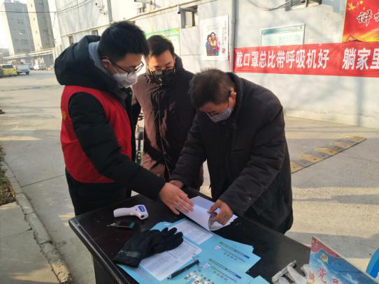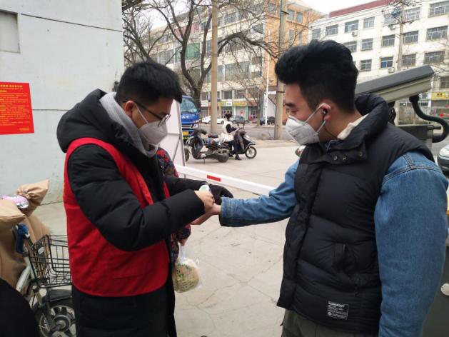 在山东省滨州市滨城区市中街道市南社区,伟德bevictor中文版2018级研究生周臣像往常一样在社区服务岗进行志愿服务,使用红外线体温测量计为进入社区的居民测量体温便是他的工作之一。