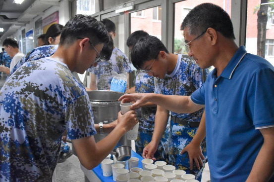 在各班级负责人的组织下,学院2023级新生们有序排队前往宿舍楼下领取姜茶,学院党委书记宋西路、党委副书记高静、学生工作办公室辅导员们将温热的姜茶递给同学们。宋西路勉励新生们要发扬吃苦耐劳精神,为自己未来四年的学习生涯系好第一粒扣子,把军训中的优秀品质延续到日后的学习和生活中去。有一位同学接过姜茶时说:“感谢学院领导和老师们的暖心关怀,能够来到山科、来到伟德bevictor中文版真是既幸运又幸福。”